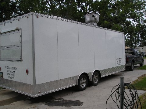 100 amp panel box, 2-64″ , 2-64″x40″ Concession Doors, 2-64″x40″ Concession Serving Windows, 6-4ft double flourescent lights, 1 Roof Vent, Light Switch, 8-Double 20amp dedicated outlets, 3-Compartmental sink with drain boards, 6′ Interior Counter (24″), hand washing sink, Fresh Water Tank, Waste Water Tank, Hot Water Tank, 4-Propane Tanks with brackets, Air Conditioning, 12′ Exterior fold-out Cuounters, 2-36″ Flat-top Grills, 1-40″ Deep fat Fryer, 1-6 Burner Oven, 3-Well Steam Tables, 2-36″ Stainless Steal equipment Tables, 1-36″ Exhaust hood/with splash guard/installed, Wall mounted Fire Extinguisher, & 19 Cubic ft. Stainless Steel Refregerator.